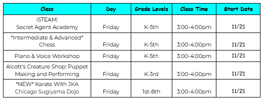 ChicagoSMA|Enrichment and Alcott Elementary School have teamed up again to offer after school group classes led by local expert artist-teachers. This is a wonderful opportunity to introduce your child to a new skill or continue learning! Come Join us!